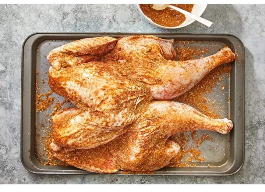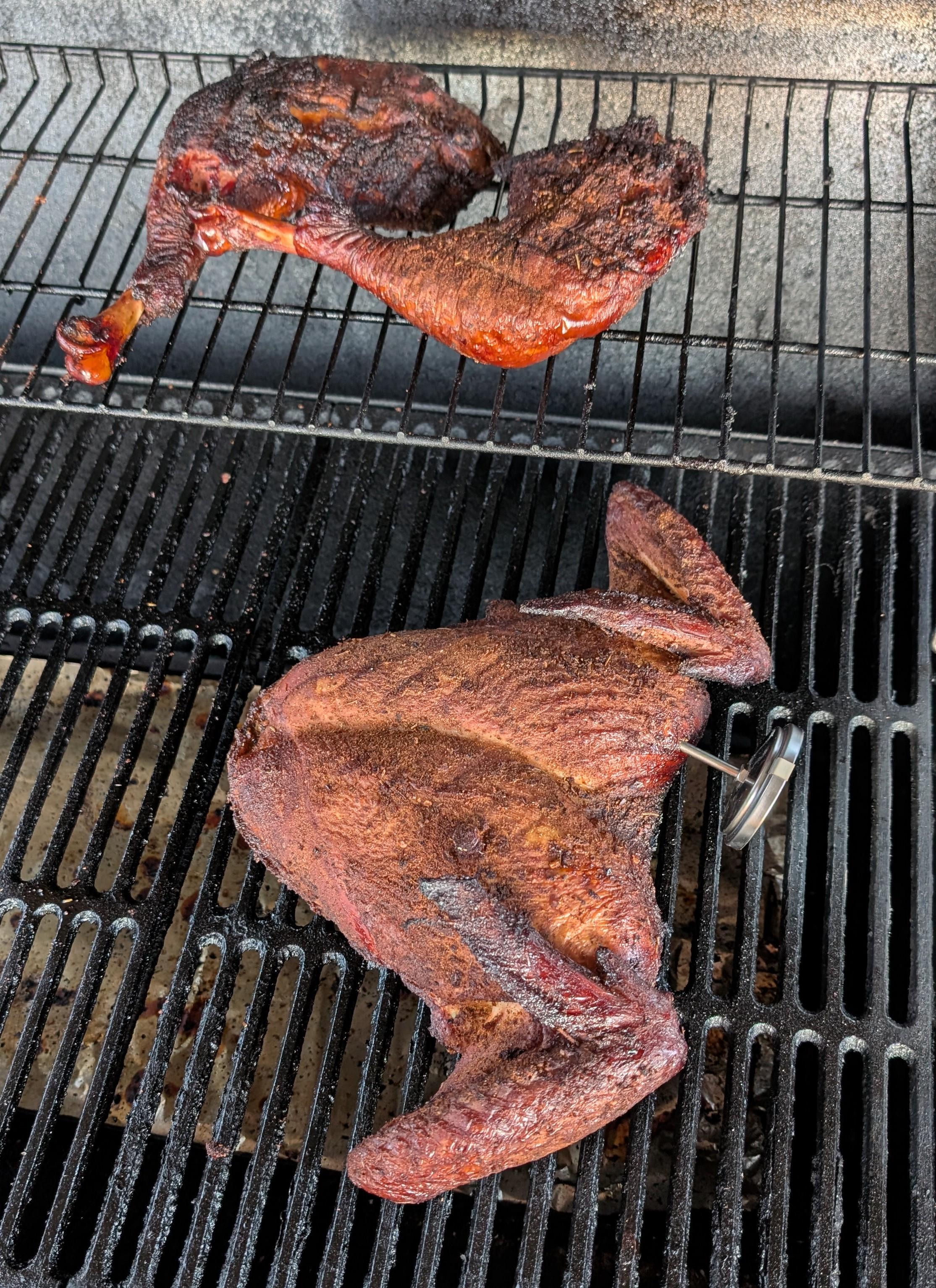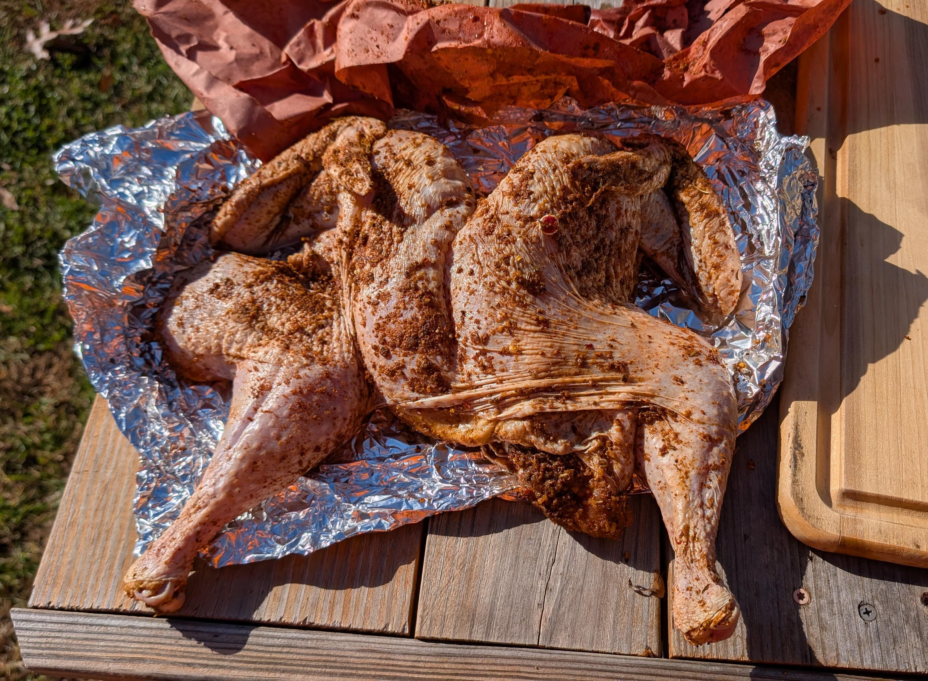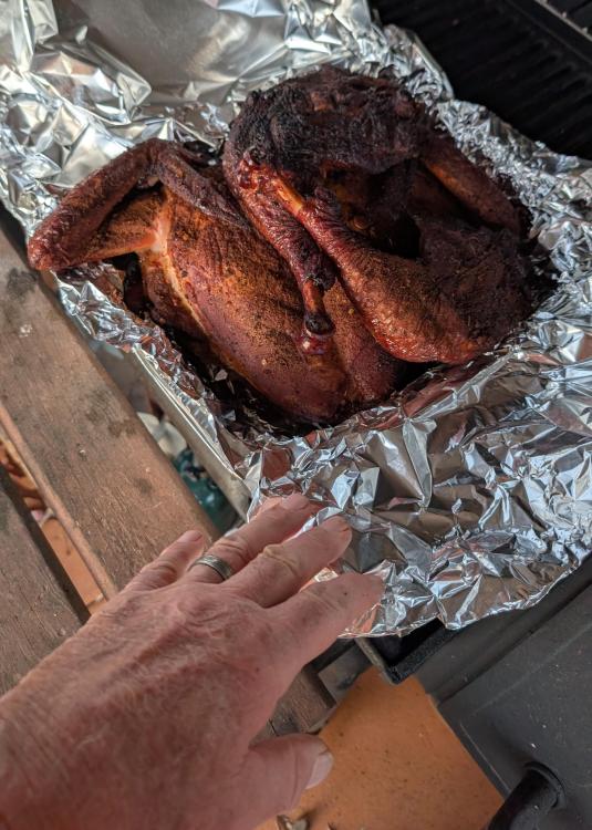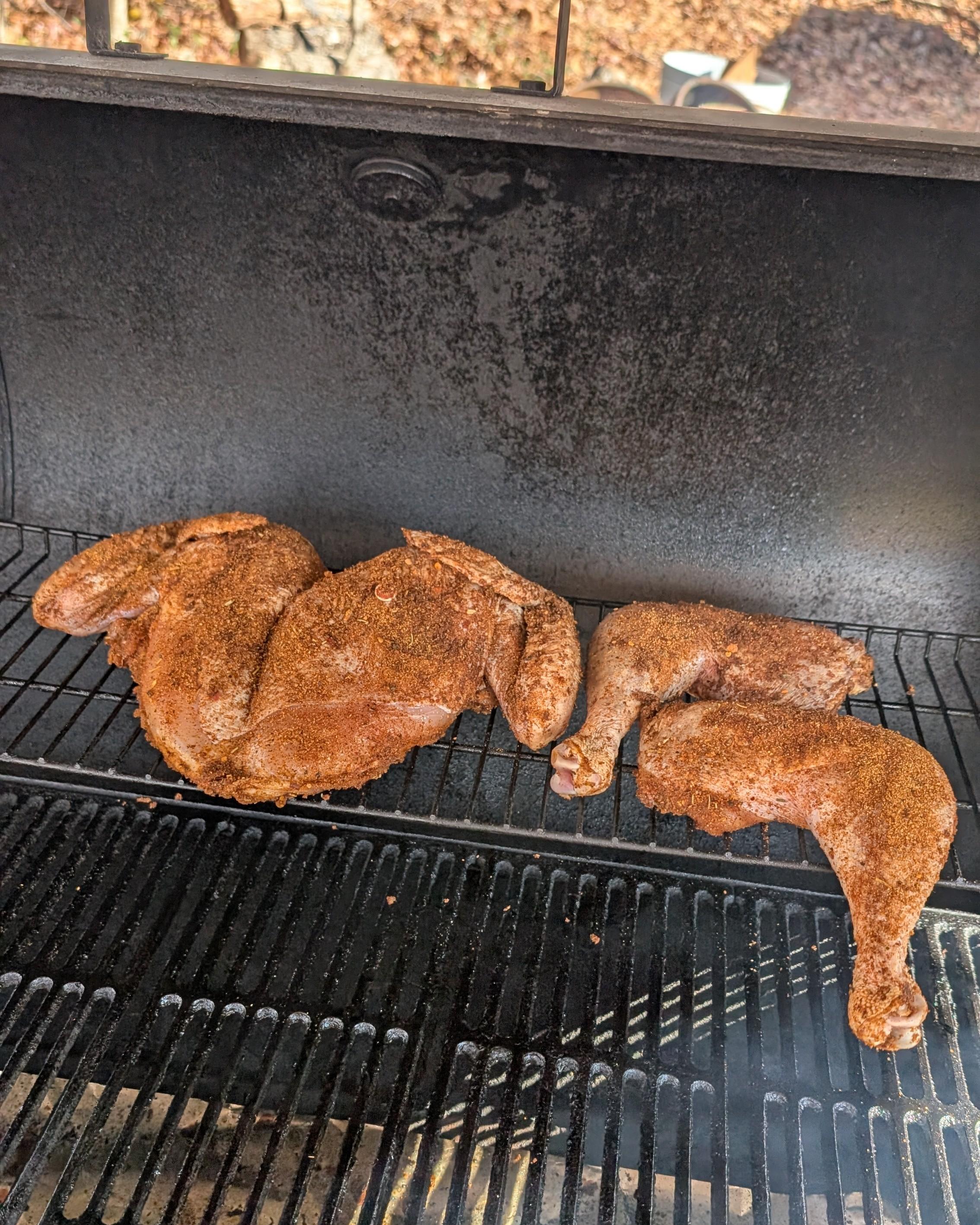 I've been seeing lots of pictures and videos of spatchcocked turkeys lately, and they looked really good after they were smoked. They looked like this at first- I've never done one but i've been wanting to try it. So I did yesterday, but much like the pictures of the hamburgers in the window at the Tastee-Freez, mine looked nothing like the pictures I saw. Mine looked like a disaster. So I just cut the leg quarters off and cooked it on the offset smoker kinda like a big chicken. It never did get done, I couldn't get the temp. up on the smoker. I blame it on the wind, it was very windy . I should have either put it on the Pit Barrel or grilled it like chicken. I guess. Anyhow, I pulled it off at 150 degrees and I haven't decided yet whether to put it in the oven today or put it on the grill until it's done, and hope it's not dry as a chip. I think I'll put it in the oven at about 200 degrees.