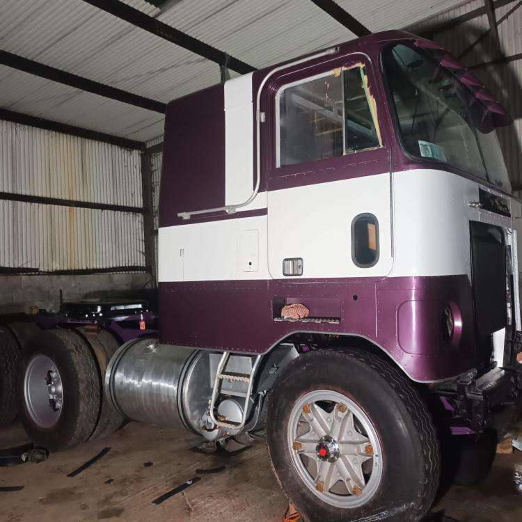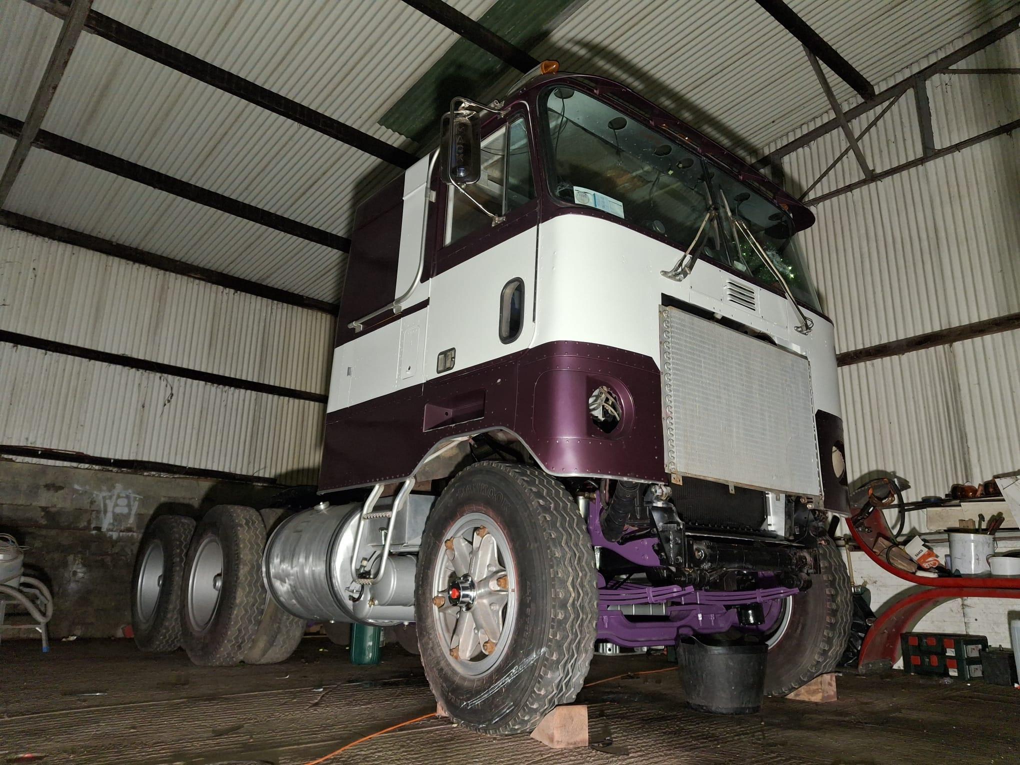 Ok guys just another little update on the Cruiseliner transformation...we have almost all mechanical work done except our clutch throw out bearing needs adjusting as its has 3/4in gap instead of 1/2in, can anyone advise us on the proper way to do this?....The truck is running and driving again so whats left to do??? We have to rewire rear lights fit headlights fit bumper and we are still looking for tyres.The cab has to be retrimed inside to match the movie truck and the stripes/signwriteing have to be applied.We are delighted we have come so far this year and hope to finnish the truck for the show season starting April'26.We thank all of you for your help with our truck,couldnt have done it without you guys...Heres a few pictures of how it has turned out so far including some experimenting with differen light/shadows. Paul