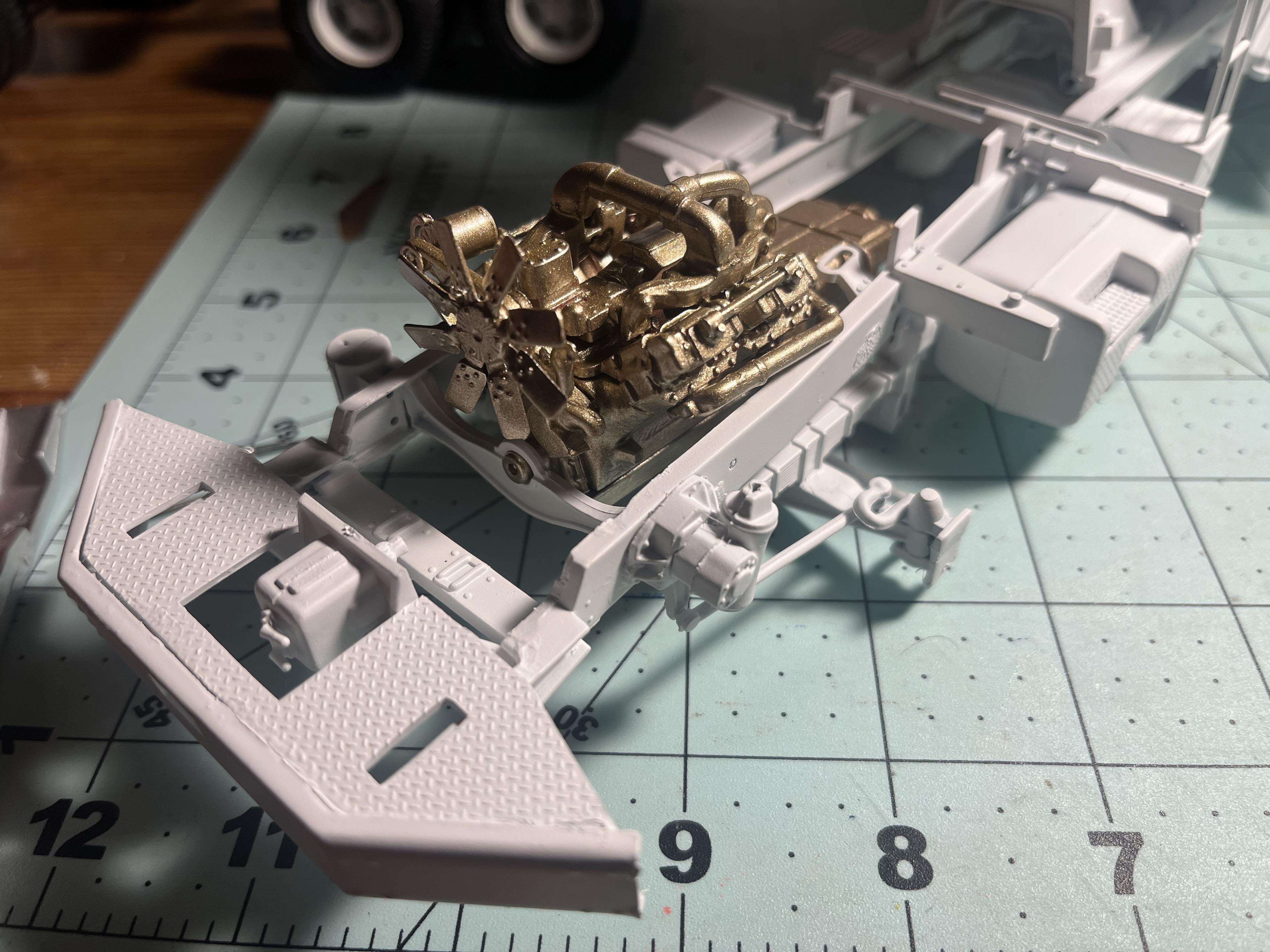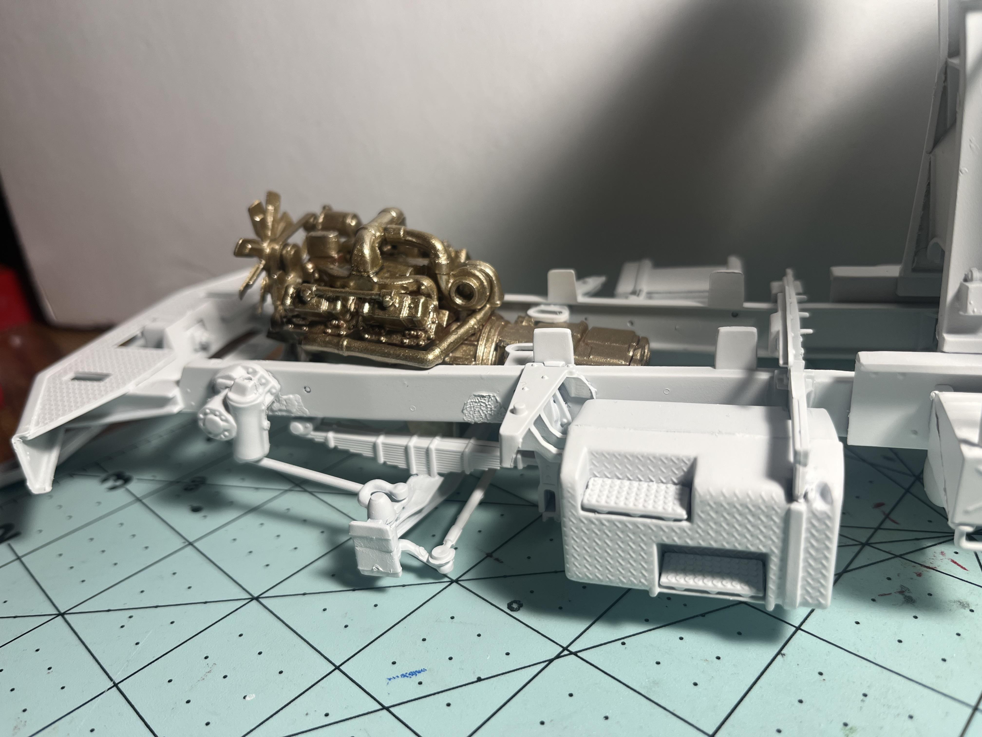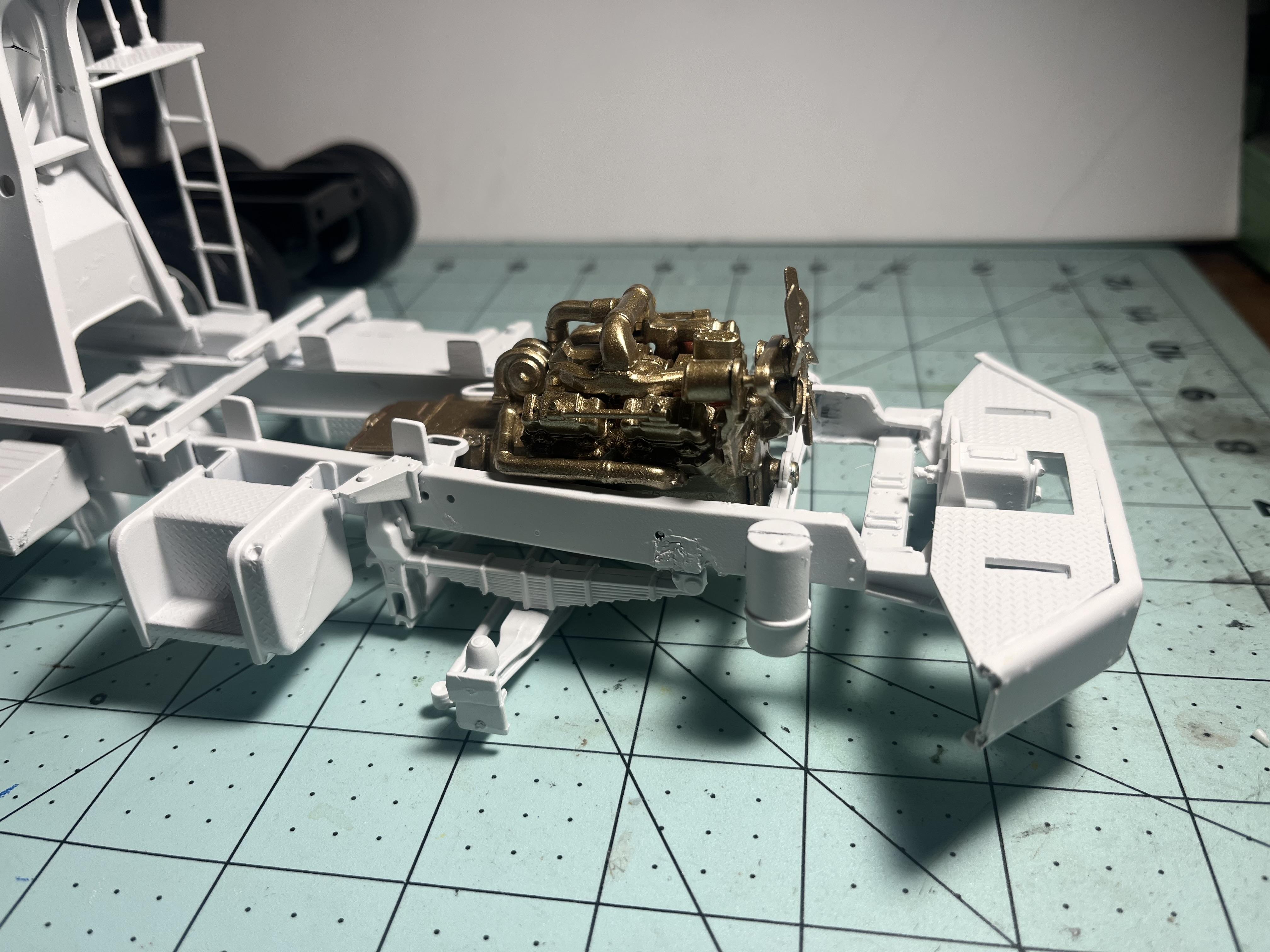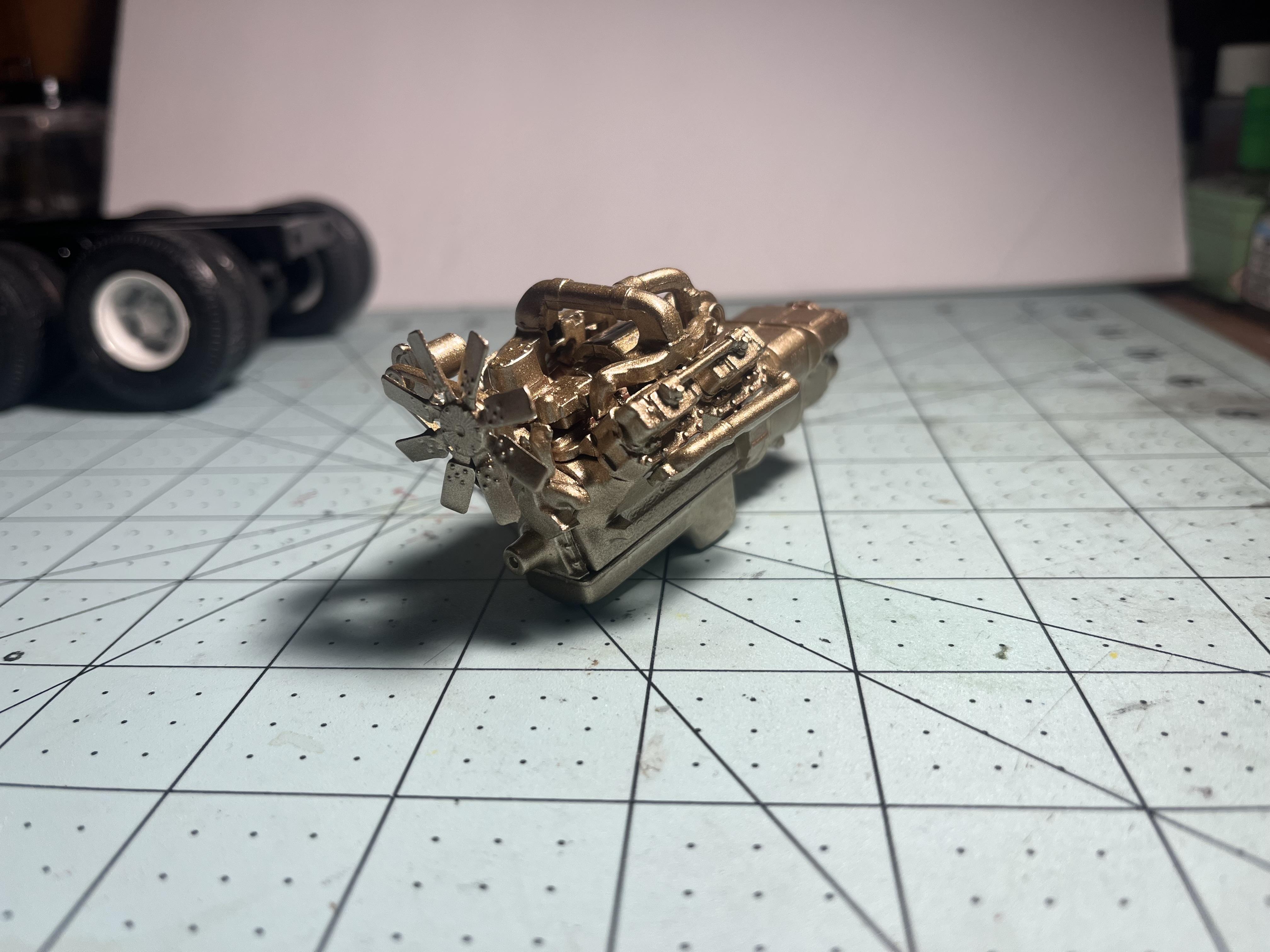 I’ve painted the engine it was the only gold spray paint I had now it’s in the frame next up is adding the radiator and the wheels and painting the interior. -