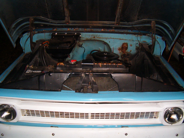 Here's my truck, wheels chocked and jack stands in place, right before we removed the 4-speed SM420 Transmission.