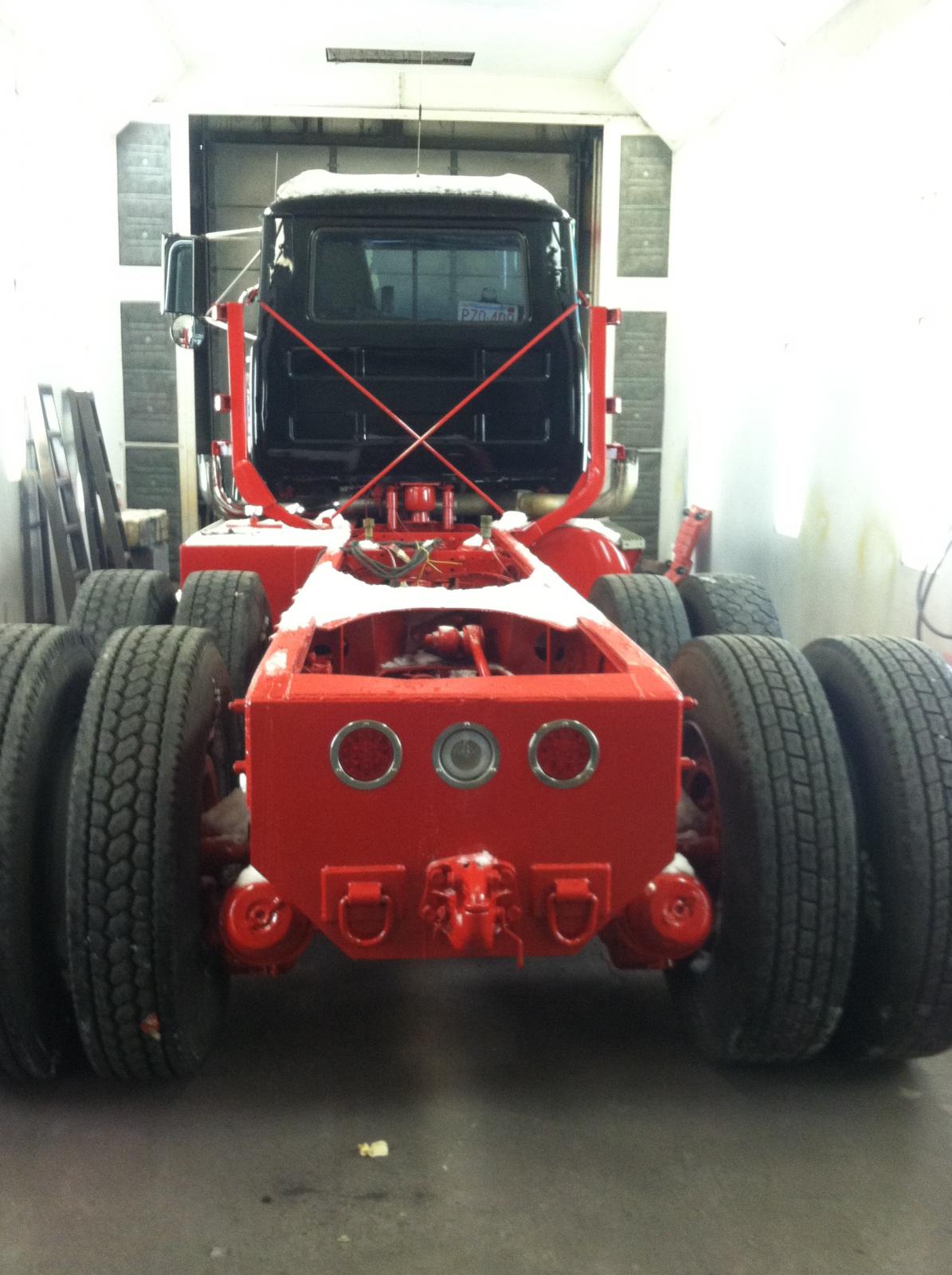 Went and picked up truck from painter fri, to bad it snowed out nite before and roads all salted. So just spent the last 3hrs washing and cleaning the frame by hand to get all the road grime off and clean it up to see what the paint job came out like. Very happy with the results, also was a good Christmas in my house my wife gave me a new Bostrom seat, the original one from Mack that came with the truck when new and my daughters gave me new bulldog mirrors for the truck and daughters boyfriend gave me new Mack emblems that go on the hoods sides. To say I was surprised is an understatement, that my girls would go to all that to get me those things for my truck with out even asking or hinting at it even coming.