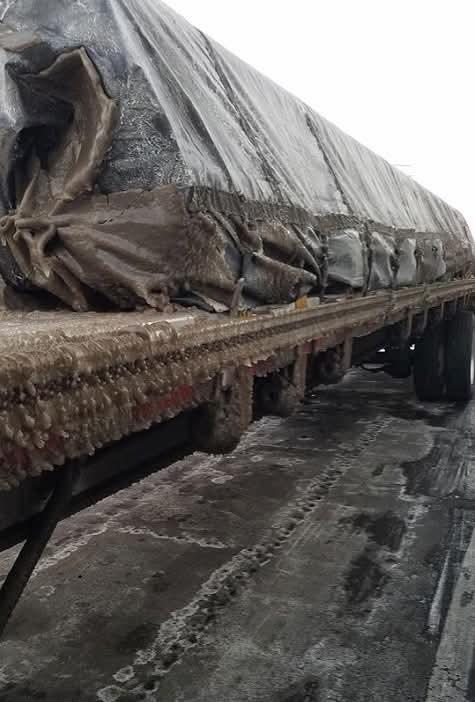 Load of steel I took to Bristol, TN. one time. Picked it up in Richmond and accumulated this much ice along the way. Load of lumber, I had 4 straps on each stack, and a belly strap on the highest stack. Load of beams I took to sunny Florida. I had a chain looped around the top stack in front that went in front of the bottom stack, and an extra chain or two on the bottom stack. I've seen more pictures and videos of trucks that had beams or pipe go through the cab in the last 10 years or so than I did the whole time I was driving, 42+ years. And the one thing that every single one had in common was that the beams were strapped, no chains. I think now the thought is "I'm not going to chain this, I ain't got time. I'll throw a few straps across it and ride".