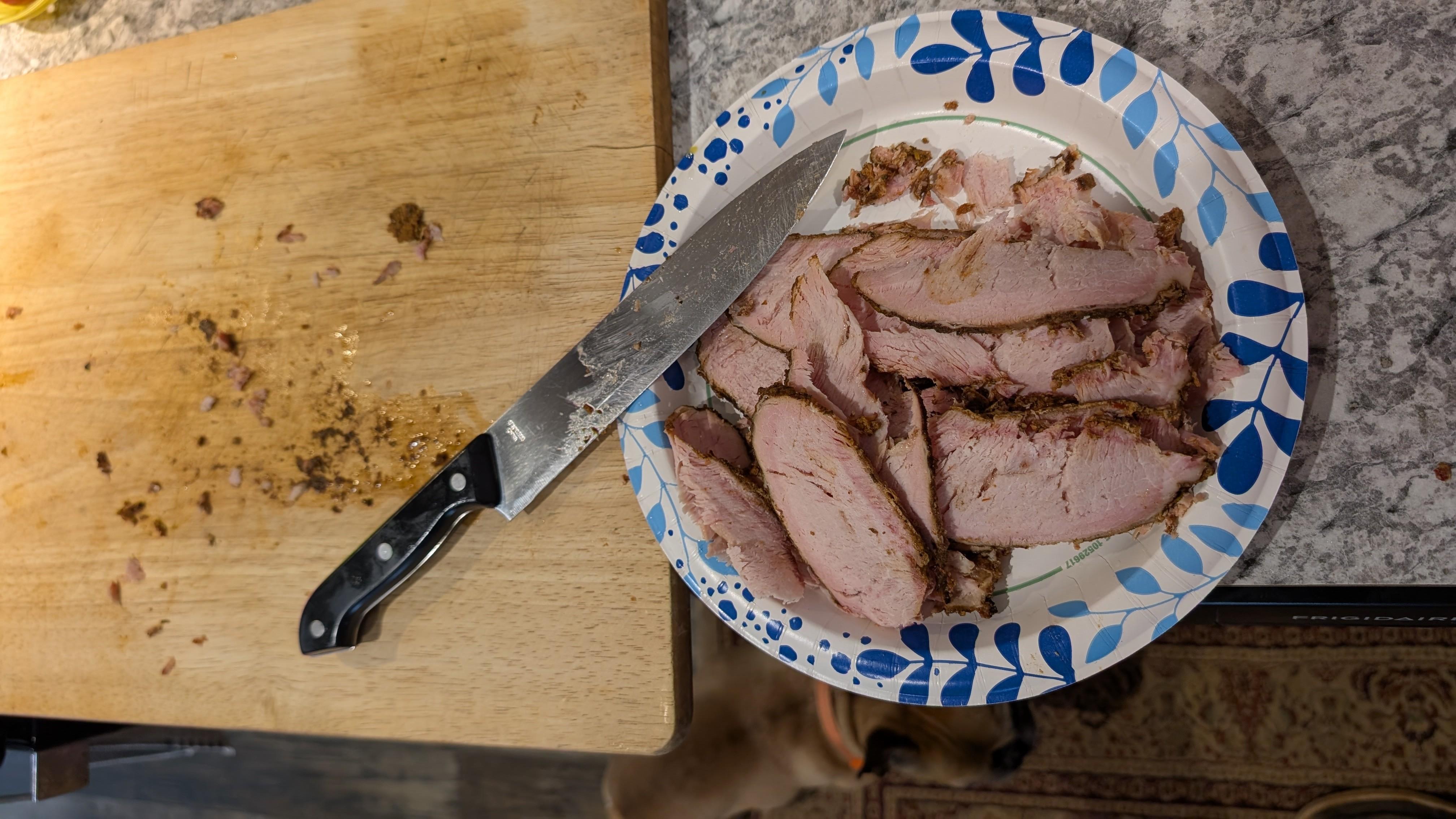 Zina said we're having Cuban sammiches tonight and she wanted me to slice some of the pork loin real thin, so thin you could read the newspaper through it. So I did , maybe not quite that thin, but as thin as I could get it with a knife that's not as sharp as it could be. I didn't even taste it yesterday, just wrapped it up and stuck it in the fridge after it cooled. I still have a rack of leftover ribs in the fridge! But I did sneak a sample or three while I was slicing, and it was fantastic! I'm a barbecue person, don't know much about Cuban sammiches but I can't wait to try one!