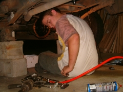 The exhaust pipe didn't want to let go of the manifold, so Seth and I are discussing how to make it cooperate. -