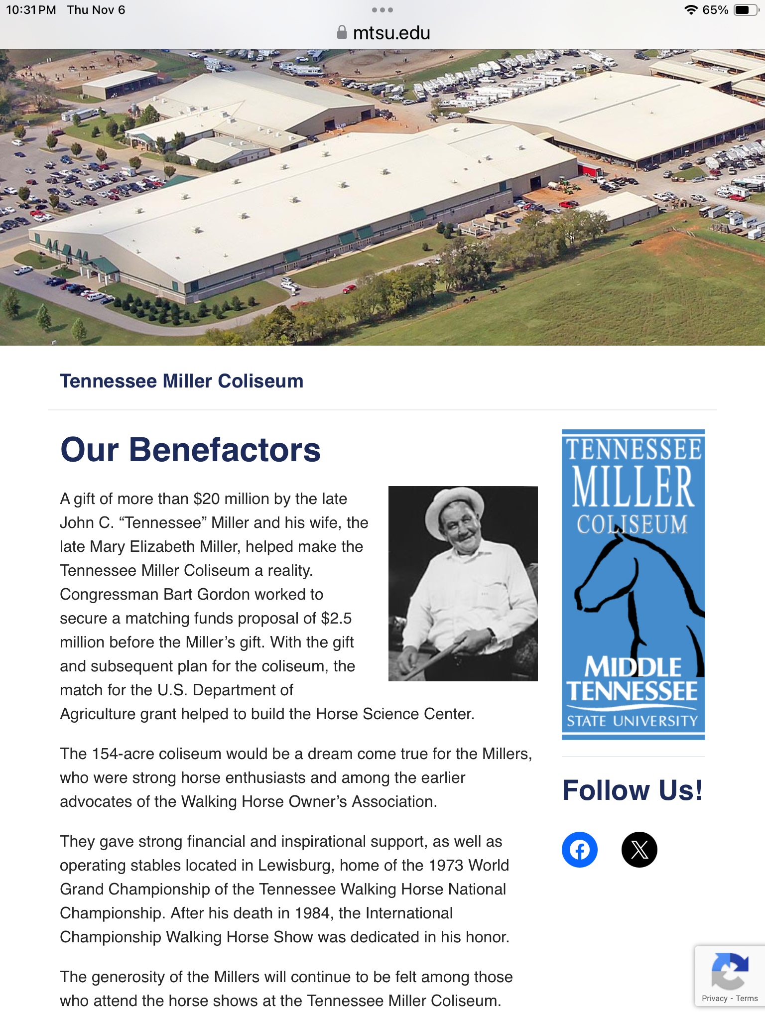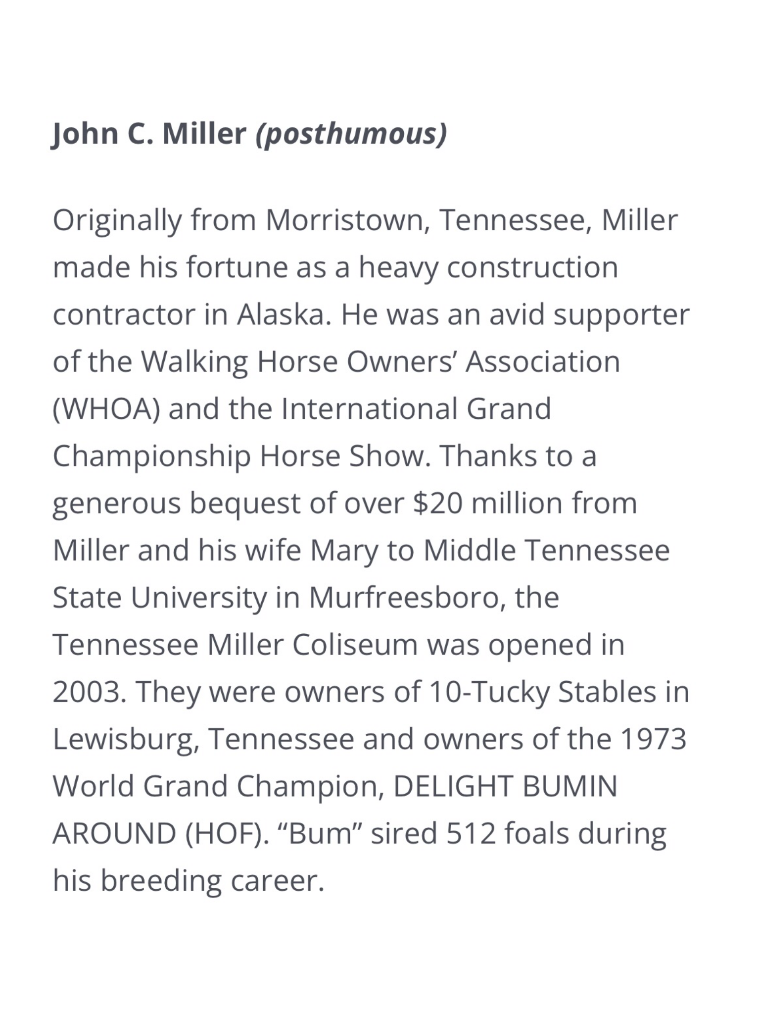 I found out a few more things about the Millers , mostly from his nephew and some from the Abees that worked for them. Evidently 10Tucky Stables & Farms was one of the most successful in the Walking Horse community in the 70s and early 80s . John C “ Tennessee “ Miller passed away in 1984 , His wife in the early 90s , they had no children. They left most of their fortune to Middle Tennessee University, Over 20 Million Dollars. The 154 acre complex was built with the money . They had an auction at 10Tucky Stables, Joe Jaines said he didn’t inherit the LTH , he was the highest bidder ( he never told me what he paid) . He brought it to White Pine , Tennessee . A few pictures, some staff at 10Tucky in 1978, The John C “ Tennessee “ Miller Colosseum. And a write up on his induction into the Walking Horse Hall of Fame.And 10Tucky as it looks today, privately owned. -