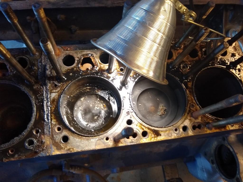 I'm considering a complete rebuild of my END673. It's not the original engine. Fuel injection: Needs new lines. Straight or pre-bent are sold as a pair - if someone is interested in a set. Injectors "look" OK for a quick (not expensive) rebuild. Cylinder heads: Pulled the valve covers, it looks like a fairly recent valve job - or at least new spring! Found a broken flat-head phillips screw sitting there doing nothing - no idea. A lot of carbon buildup on the intake and exhaust ports. Slight sign of water on #4 intake valve Pulled both heads Cylinder #4 shows pitted rust. It's not seized. Some head studs had been removed/installed with vise grips - I've seen a lot worse, but. Two different heads Two different head gasket types Two different rocker shaft mounting brackets - one was stepped, the other solid. Haven't dropped the oil pan yet. Thoughts on a complete rebuild?