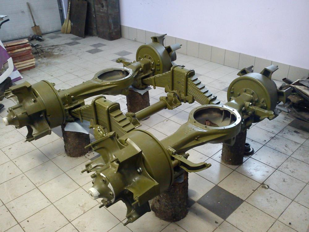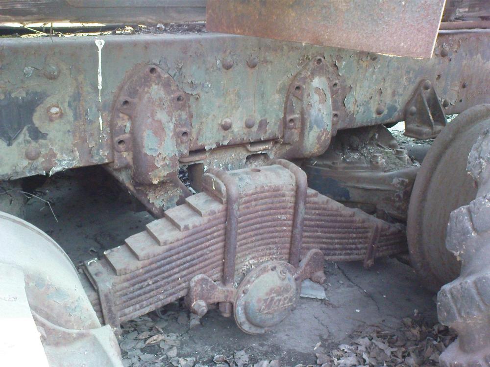 Definitely an old Mack rear bogie. 10 bolt carrier mounting pattern. Off an L-model or early B-model. Had those "elephant ears" attached to the chassis and the trunnion brackets attached to them. By the bolts which were cut by torch. My guess the only way is to check out junk yards with really old Mack stuff. But those trunnion axles tend to be rusty where they (are supposed to) spin in bronze bushings due to long gone seals. So if even the right setup would be found there are very high chances on need of heavy rebuild of the shaft ends and the bushings. I've done that for my truck.