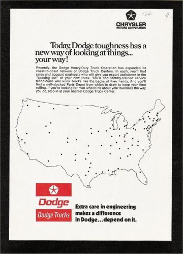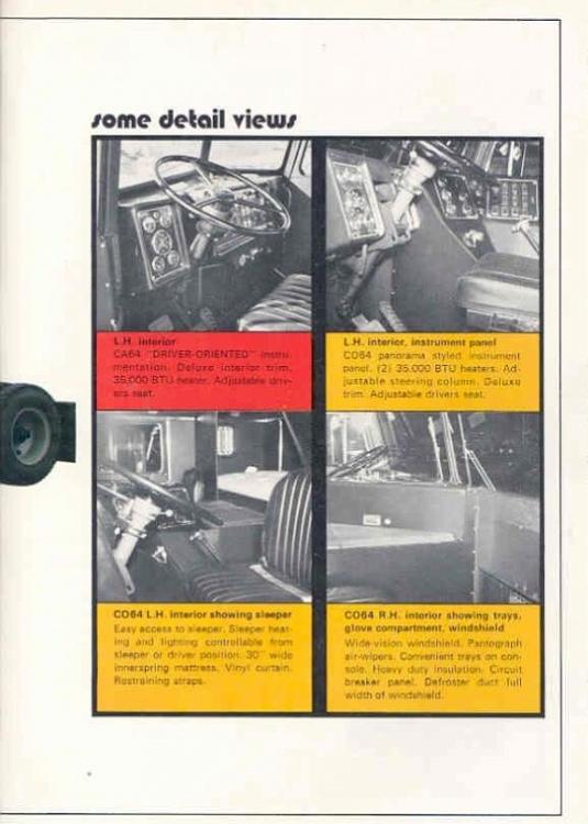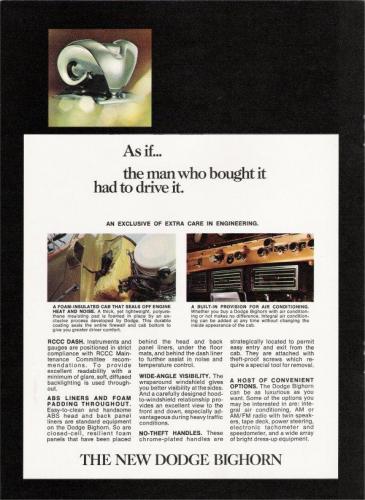 The short-nosed fiberglass hood “Hi-Cab” Big Horn 900 was to have replaced the aging steel hood CN/CNT900 (at least for on-highway applications) in the 1976 model year, had Dodge not decided to terminate heavy truck production in 1975. Two prototypes were built, with Cummins and Detroit Diesel power, and both trucks still exist today. Press Release: Dodge Truck Operations, Chrysler Motors Corp., Detroit, Michigan, now has two Big Horns: the Big Horn 950 long conventional introduced in 1973 and --- now for 1974 --- the Big Horn 900 conventional. Scheduled for production at Dodge's Detroit Sherwood Truck Plant, it will be available with wheelbase range from 134 in. to 212 in. and GVW range from 28,000 to 60,000 lb. With power ratings between 230 and 350 hp, engines available for the Big Horn 900 include Detroit Diesel Allison's 6-71N and 8V-71N plus Cummins diesels NH 230, NTC 250, 270, 290 and 350. Dodge Says the Big Horn 900 will meet all government regulations for airbrakes and noise control when introduced. The Big Horn 900 will have Rockwell-Standard's Skid-Tool computerized brake control system. To help meet the brake regulations, Dodge added beefed up brakes, hubs and drums, increased power input to the brakes and suspension capacity. To comply with BMCS interior noise regulations, Dodge includes improved insulation and seating. Insuring the Big Horn's ruggedness and longevity, Dodge builds the 900 cab of heavy gauge reinforced steel, sets it on 110,000 psi straight frame rails and connects cross-members with grade-eight bolts, locknuts and large washers. The 900, like the 950, has a forward tilting, reinforced fiberglass front end. The Big Horn ornament identifies the 900 and serves as a handle when tilting the front end. Under the hood, Dodge's attention to serviceability is seen in a design that has all wires color coded for easy tracing through protective plastic tubing, supported by insulated chassis clips, and connected by bolt-eyelets. Electrical connections are gathered in two groupings. Five fusible links, circuit breakers and relays are positioned on engine compartment firewall and inside the cab on the back panel. Both groups are protected from dirt and grime with durable ABS plastic covers. Inside the cab, a newly styled, integrated RCCC instrument panel and glove box are standard. Also standard is an interior trim molded of ABS plastic with insulated backing. Interior cab options include a high-line trim package with color keyed door trim panels, carpeting and soft, padded vinyl headliner inserts and back trim panel. Other options are integral air conditions, AM or AM/FM radio with twin speakers, tape deck, and power steering. . -