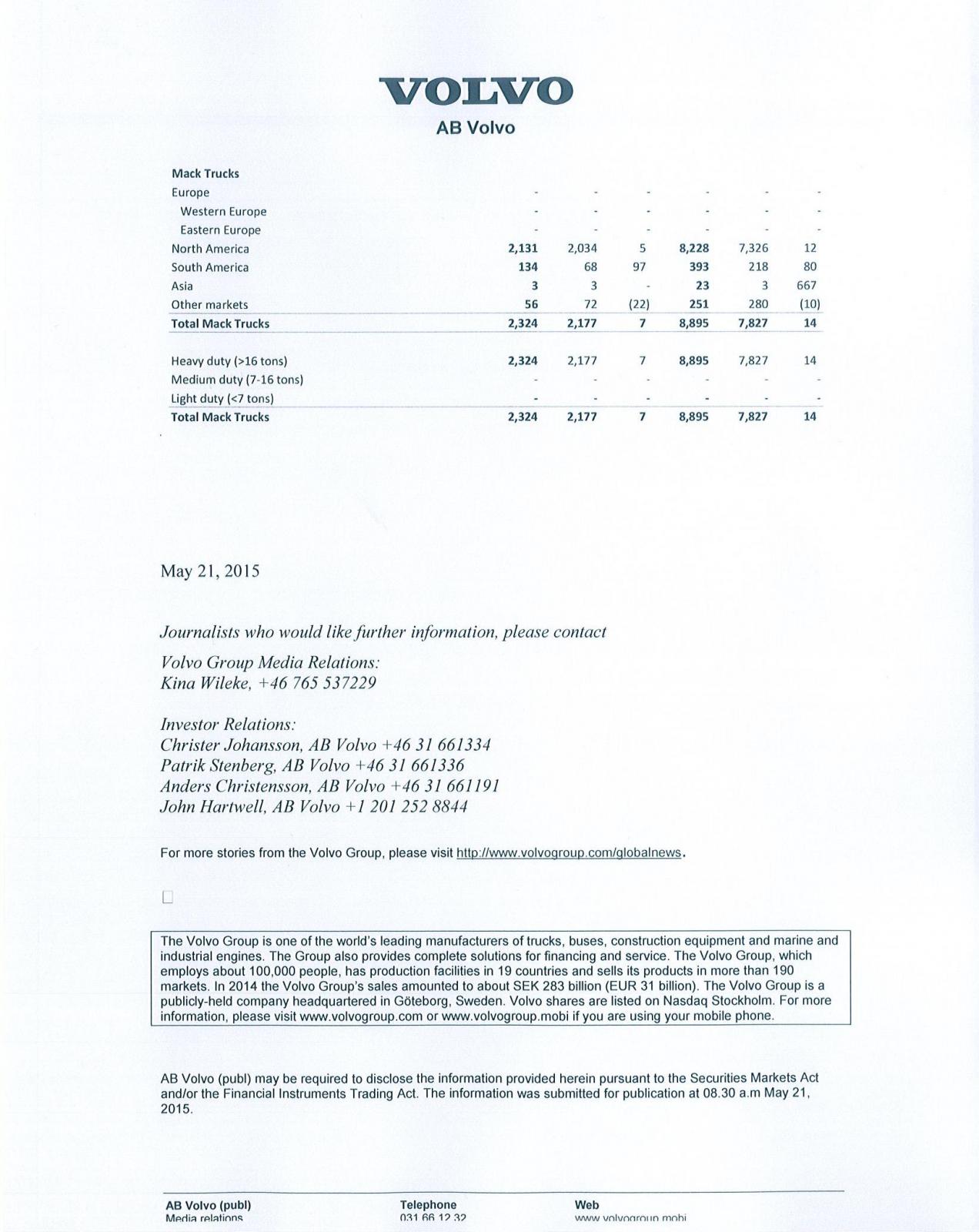 Volvo AB reported on Thursday that deliveries under its truck operations in April 2015 amounted to 17,715 vehicles.